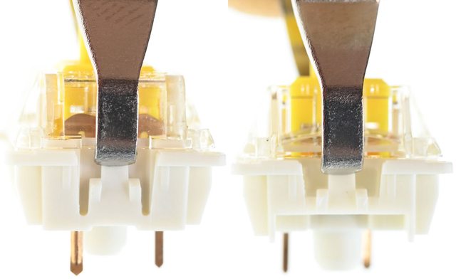 ▼鍵軸可熱插拔,將工具的夾子處對準鍵軸上下緣中央處的凸出卡榫,對鍵軸上下卡榫施