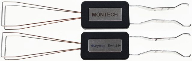 ▼鍵帽/鍵軸拆卸工具,黑色把手上面金屬銘牌有商標及Keycap/Switch標示,鋼絲處(左)