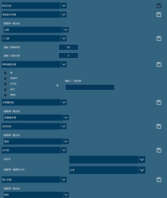 ▼按鍵設定可選默認功能(預設按鍵定義)、滑鼠基本按鍵(模擬滑鼠按鍵)、火力鍵(按鍵