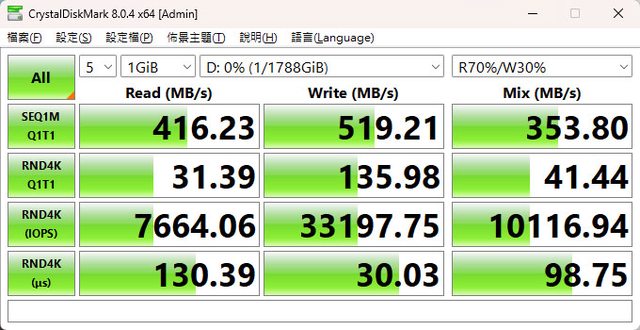▼Micron 5200 PRO SATA3 1.92TB SSD的CrystalDiskMark預設+Mix(R70%/W30%)傳輸速度