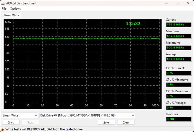 ▼Micron 5200 PRO SATA3 1.92TB SSD的AIDA64 Disk Benchmark連續寫入測試,最高速