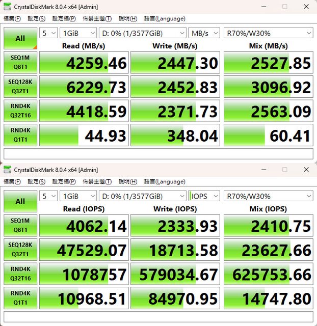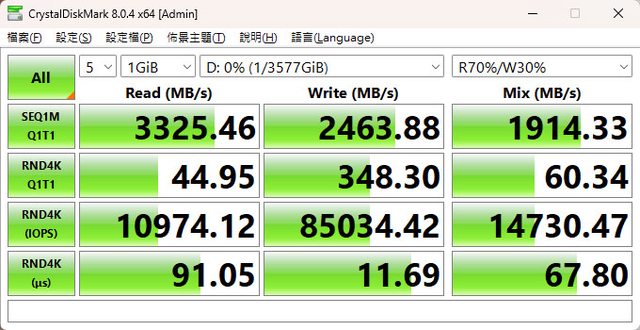 (NVMe)+Mix(R70%/W30%)傳輸速度測試