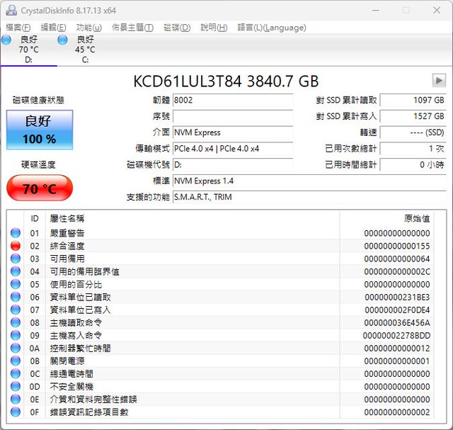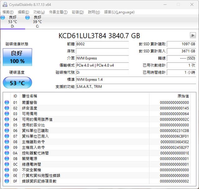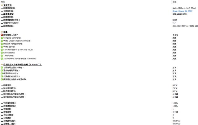 ▼KIOXIA CD6-R U.3 Gen4 NVMe 3.84T SSD的CrystalDiskInfo資訊內容
