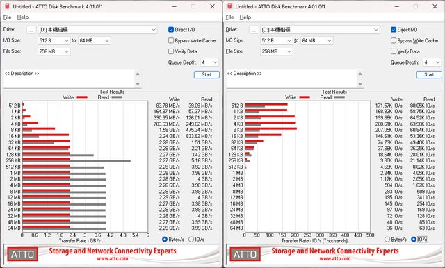 ▼KIOXIA CD6-R U.3 Gen4 NVMe 3.84T SSD的ATTO Disk Benchmark傳輸速度測試