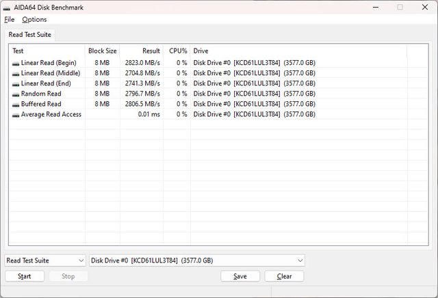 ▼KIOXIA CD6-R U.3 Gen4 NVMe 3.84T SSD的AIDA64 Disk Benchmark讀取測試