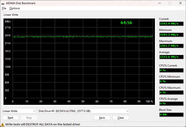 ▼KIOXIA CD6-R U.3 Gen4 NVMe 3.84T SSD的AIDA64 Disk Benchmark寫入測試,最高速