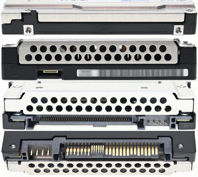 螺絲孔,2個短邊側面銀色金屬上蓋有圓形孔洞網狀通風口,其中1個短邊側面有SFF-8639