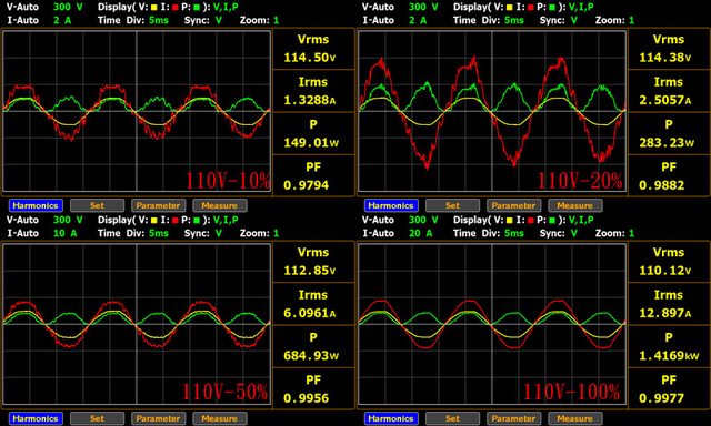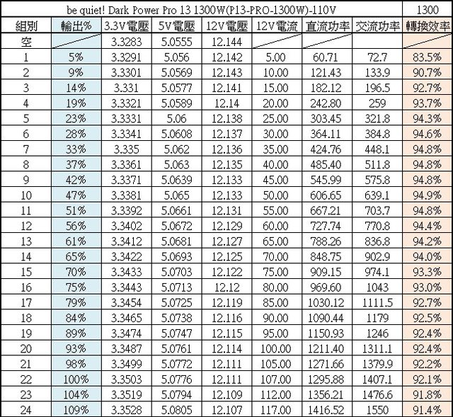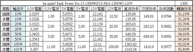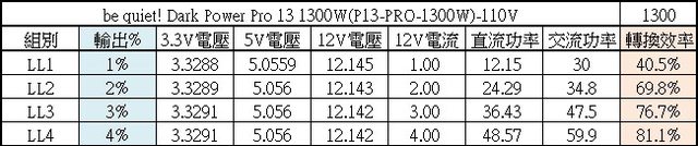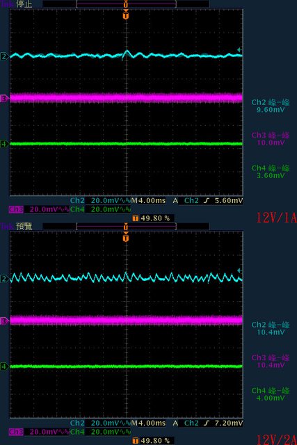綜合全負載輸出下12V/5V/3.3V各路低頻漣波分別為17.6mV/11.6mV/7.2mV;於純12V全負