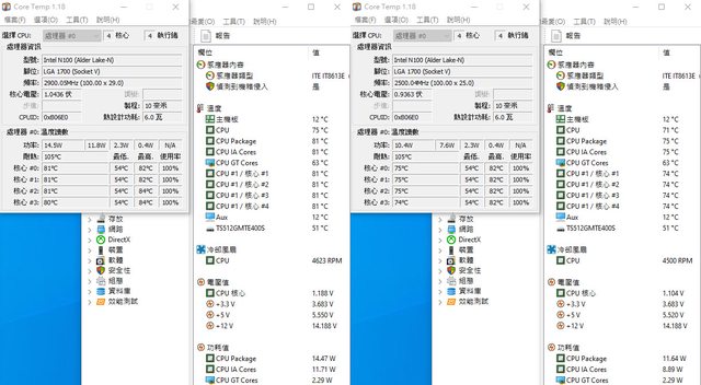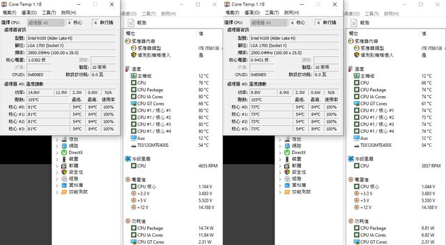 ▼進行CINEBENCH多核心測試下Core Temp及AIDA64感測器頁面,一開始處理器功率會上升