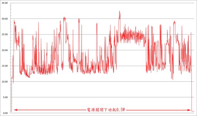 ▼直流輸入功率圖表,通電未開啟電源下功耗約0.5W