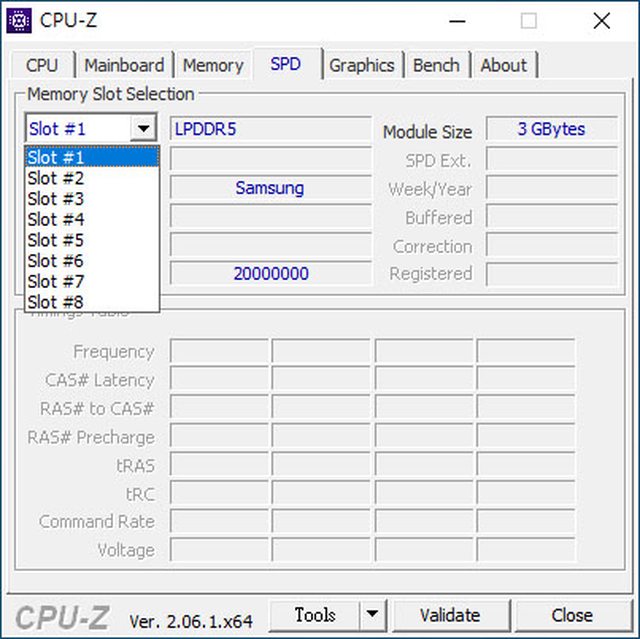 ▼CPU-Z的SPD資訊,Slot #1至Slot #4安裝4個容量3GB的三星LPDDR5記憶體,組成12GB空