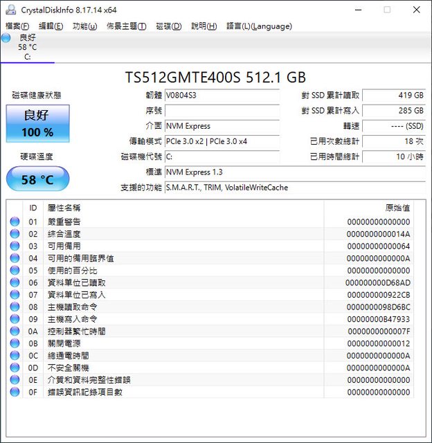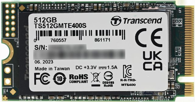 ▼Transcend創見MTE400S PCIe Gen 3 x4 512G NVMe SSD為M.2 2242單面規格,正面標籤