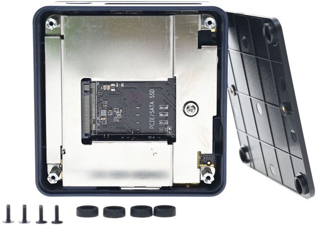 ▼鬆開底部4個固定螺絲,可取下防滑墊及外殼,內部金屬罩中間開口有M.2 2242