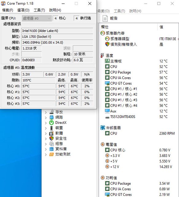 ▼作業系統待機下Core Temp及AIDA64感測器頁面