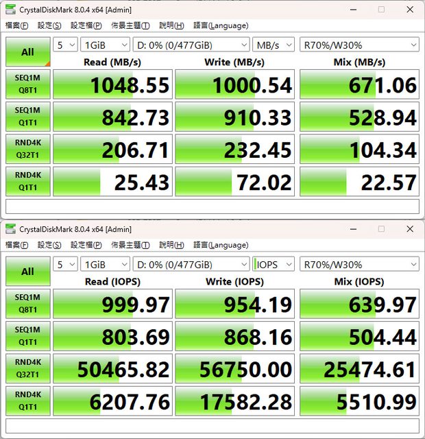 ▼CrystalDiskMark預設+R70%/W30% Mix測試結果