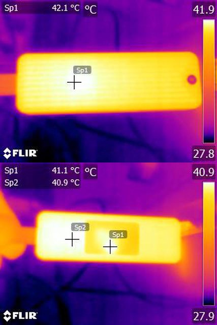 ▼未有流動氣流下,測試進行中的外接盒背面(上圖)/正面(下圖)紅外線熱影像圖