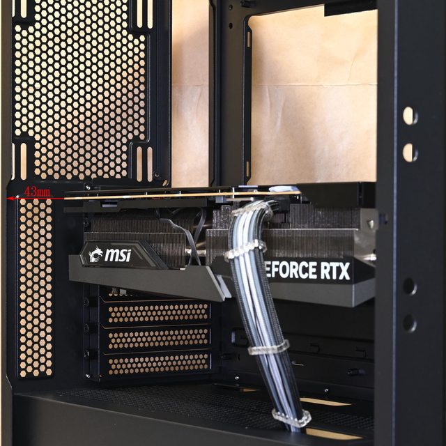▼安裝MSI GEFORCE RTX 4090 GAMING X TRIO(337×140×77mm)時,顯示卡前端與機殼前
