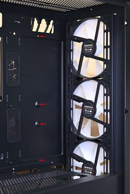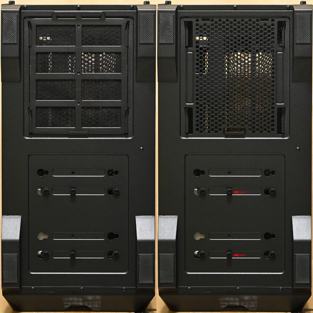 ▼底板前端增設E-ATX主機板用鎖點(紅色箭頭),不過E-ATX主機板會阻擋到底板前方穿線