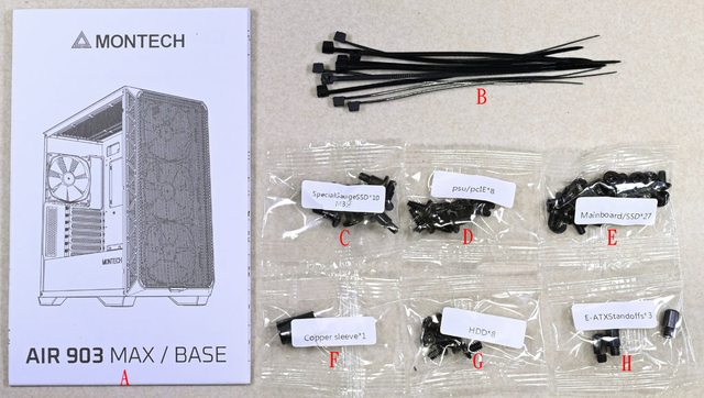 介面卡螺絲(D)、主機板銅柱/2.5吋SSD螺絲(E)、銅柱套筒工具(F)、3.5吋硬碟螺絲(G)、