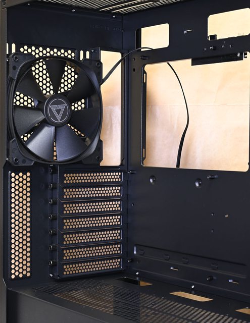 ▼機殼後方右上長條形固定孔可安裝1個120/140mm風扇。提供7個無支架標準擴充槽,均