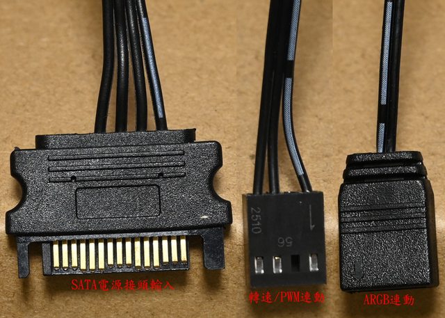 ▼風扇/燈光控制板連接線組,由左至右分別是SATA電源輸入接頭、風扇轉速回傳/PWM連