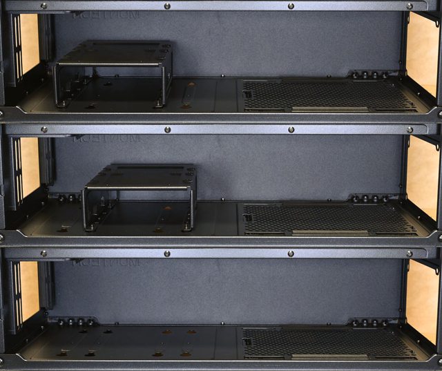 ○底部可拆卸式固定架安裝位置可2段調整,可安裝2個3.5吋硬碟或是1個2.5吋SSD加1個