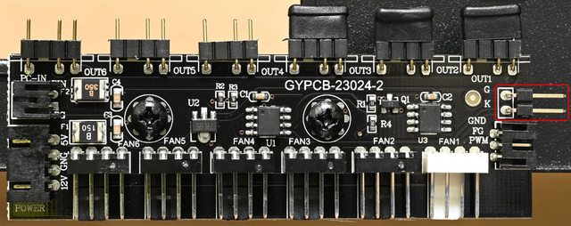 ▼燈光風扇控制板,提供6個3pin ARGB插針(OUT1至OUT6)及6個風扇4pin插針(FAN1至