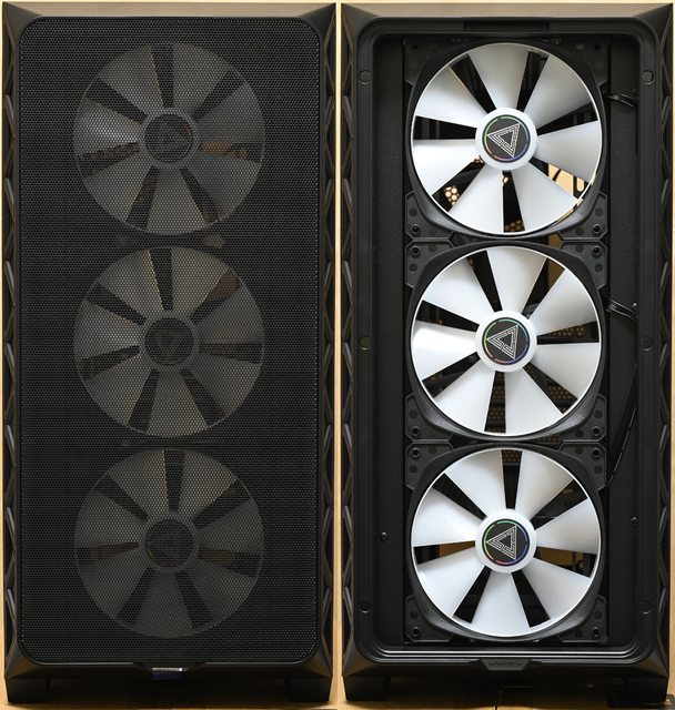 ●前方/頂部/後方/電源艙頂部可安裝最多9個120mm風扇,前方預裝3個HP140 ARGB PWM風
