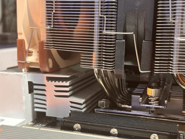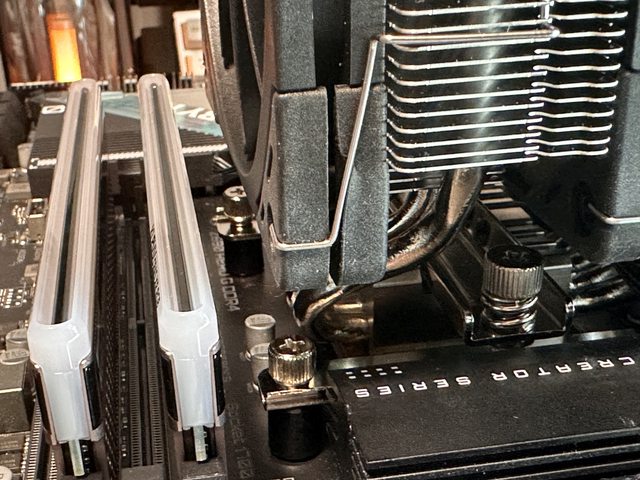 風魔3搭配個人手上這張技嘉主機板,後方加掛的風扇底部貼平散熱片時,風扇頂部也剛