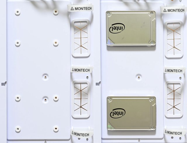 3.5吋硬碟。底板背面前方可安裝2個2.5吋SSD,底板背面右下方2個2.5吋固定架可安裝2