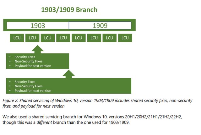 在Windows 10 1903以後則採用新的服務分支,1903與1909的內部核心與安全性更新都是