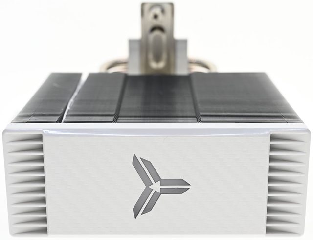 ▼散熱器本體底座左右各伸出4支6mm熱導管,並在熱導管上安裝55片鰭片,頂部裝飾蓋燈