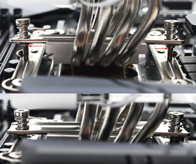 ▼壓板中間用1個手轉螺絲固定在散熱器底座頂部,兩邊設置鎖在托架上的彈簧螺帽