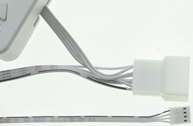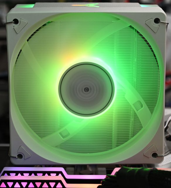 ●鋼絲扣固定的120mm變色發光風扇具備9片乳白色鐮刀形扇葉及8片減震膠墊,4pin PWM