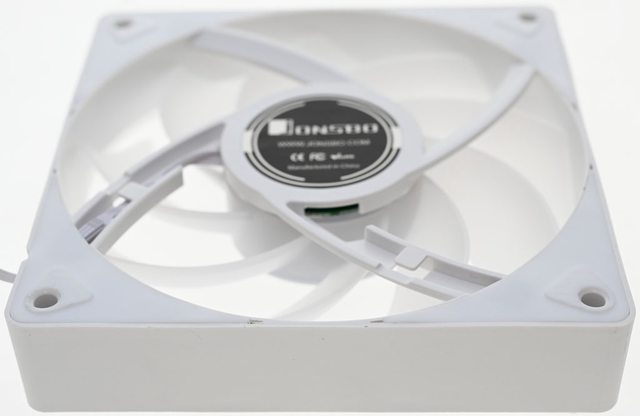 ▼120mm風扇使用鋼絲扣固定,9葉片乳白色鐮刀形扇葉軸心處有商標貼紙,風扇外框中心