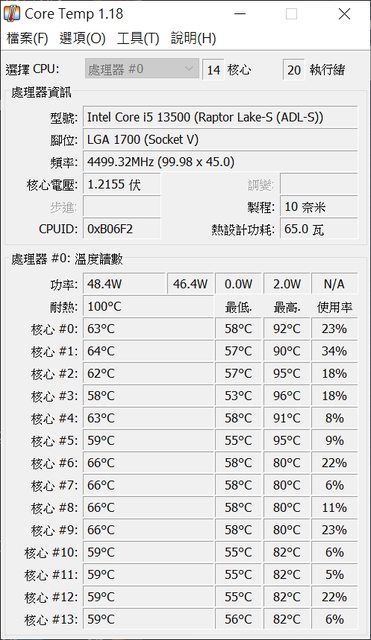 Intel Laminar RM1 h待機溫度最低 53 高負載運載滿載最高 96