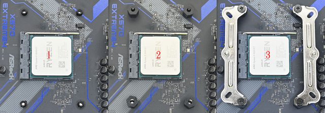 理器表面清潔後塗上散熱膏。放上散熱器前要記得先撕除處理器接觸面保護貼,將壓板上