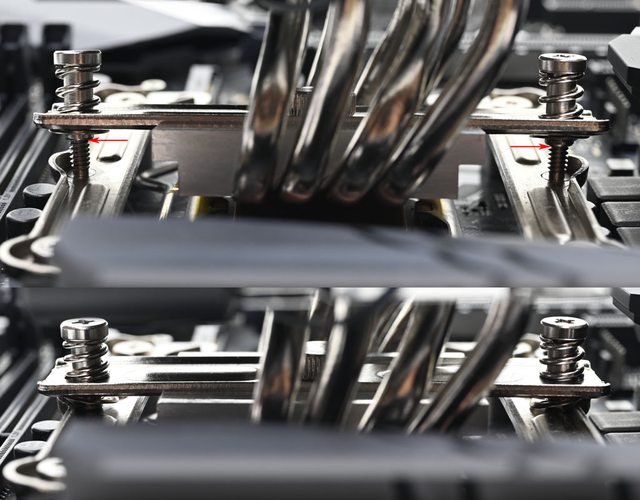 ▼安裝前先確認散熱器熱導管不會干涉主機板VRM散熱片。確認完成後取下散熱器,將處