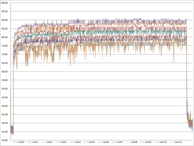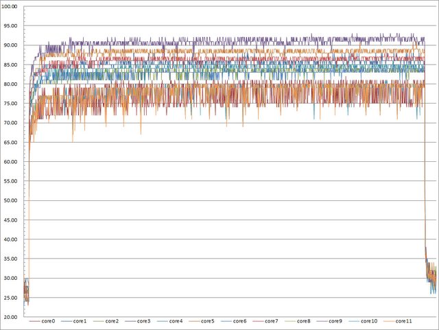 ▼前面12公分風扇搭中間14公分風扇時高負載30分鐘CORE TEMP溫度記錄圖