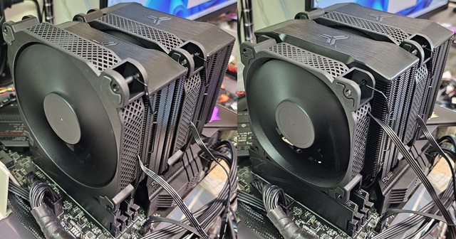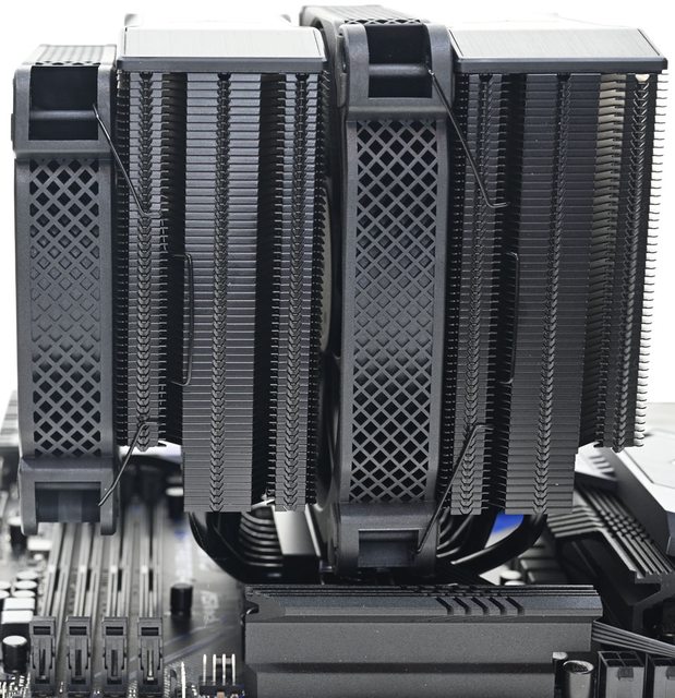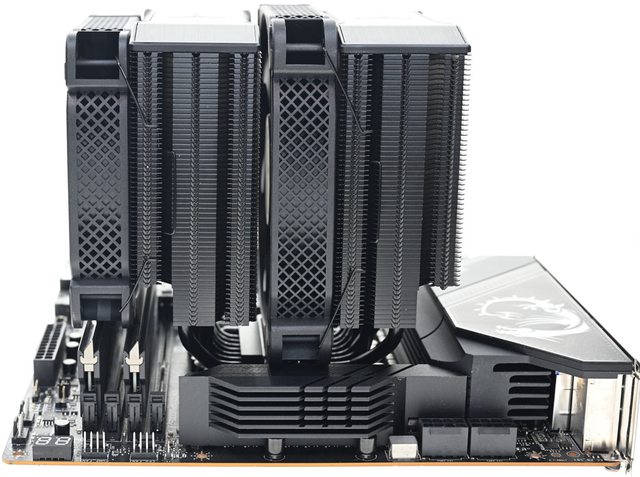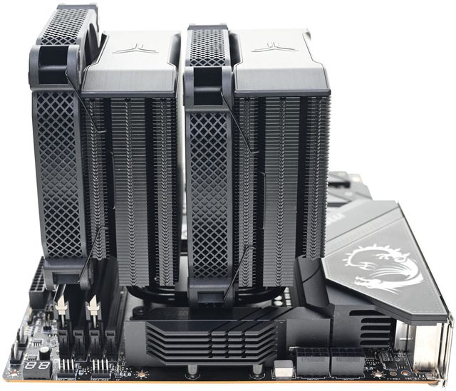 ▼前塔安裝140mm風扇,後塔安裝140mm風扇時,安裝於LGA1700平台的側面圖。搭配