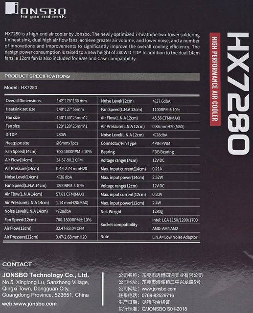 JONSBO喬思伯HX7280散熱器規格: