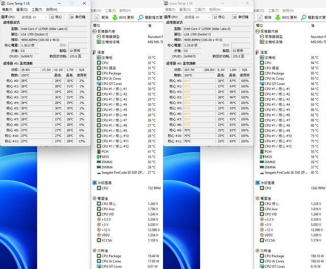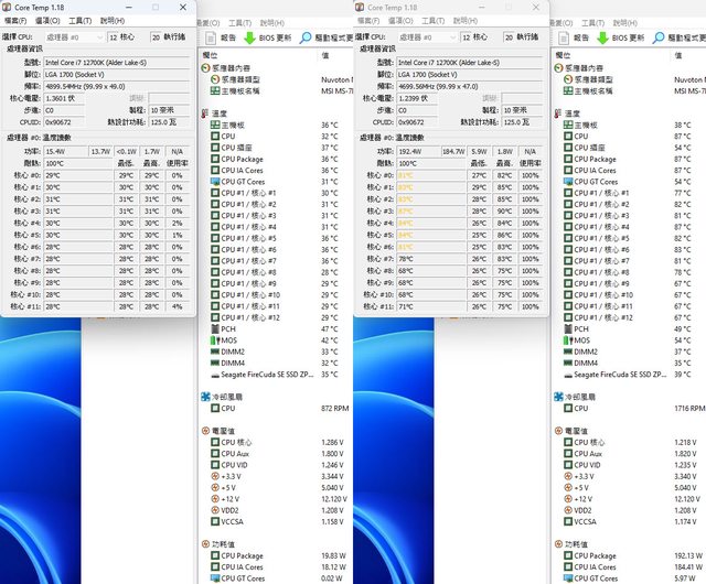 ▼效能模式待機(左)及高負載(右)的CORE TEMP及AIDA64感測器畫面