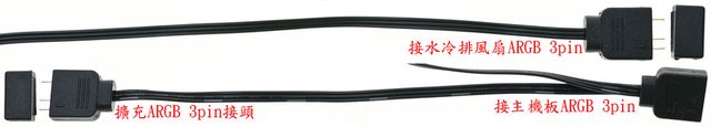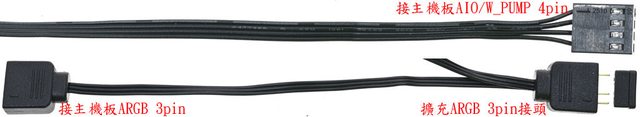 ▼水冷頭連接線組,主機板AIO/W_PUMP 4pin母頭線路長度46公分。水冷頭至擴充ARGB