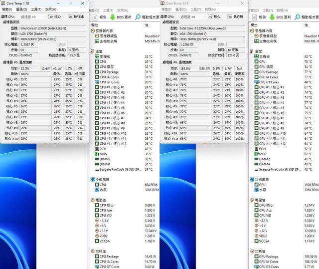 ▼待機(左)及高負載(右)的CORE TEMP及AIDA64感測器畫面