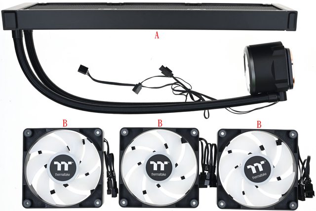 ▼包裝內有一體式水冷散熱器(A)、3個CT120 ARGB Sync風扇(B)