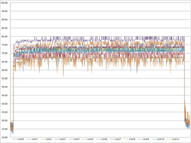 ▼高負載30分鐘CORE TEMP溫度記錄圖