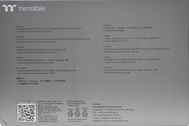 ▼外盒正面有商標、產品名稱、外觀圖、各廠牌主機板燈光同步圖示。外盒背面有商標、