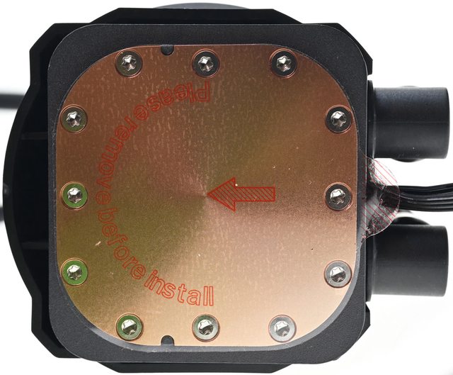 ▼水冷頭處理器接觸面有一張保護貼,上面印上”請在安裝前移除”英文
