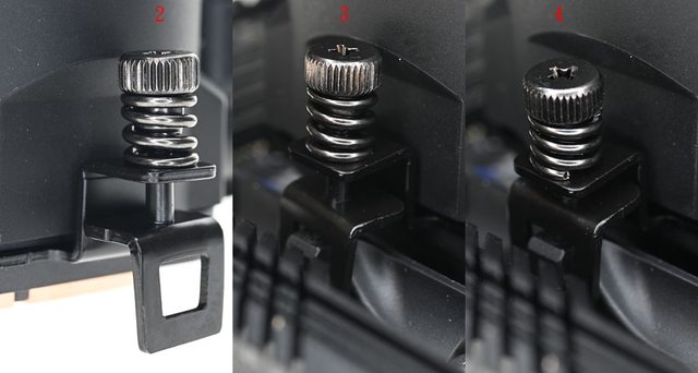 Intel托架孔洞對準黑色螺柱套入(4)。鎖上4個手轉彈簧螺帽時,一開始先轉入數圈使其
