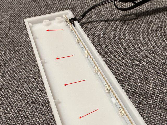 改良方法十分簡單,將燈條置於燈箱中間位置,且將燈珠方向改為向前方,則燈箱上下方